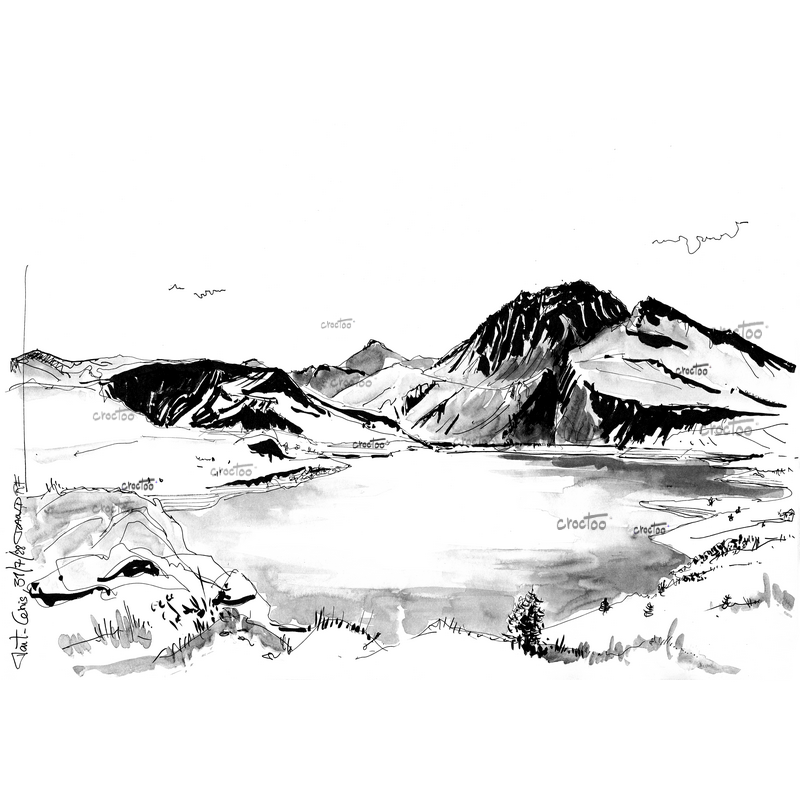 Le Lac du Mont-Cenis sous la Turra : Reproduction d'un dessin encre et aquarelle de 2022