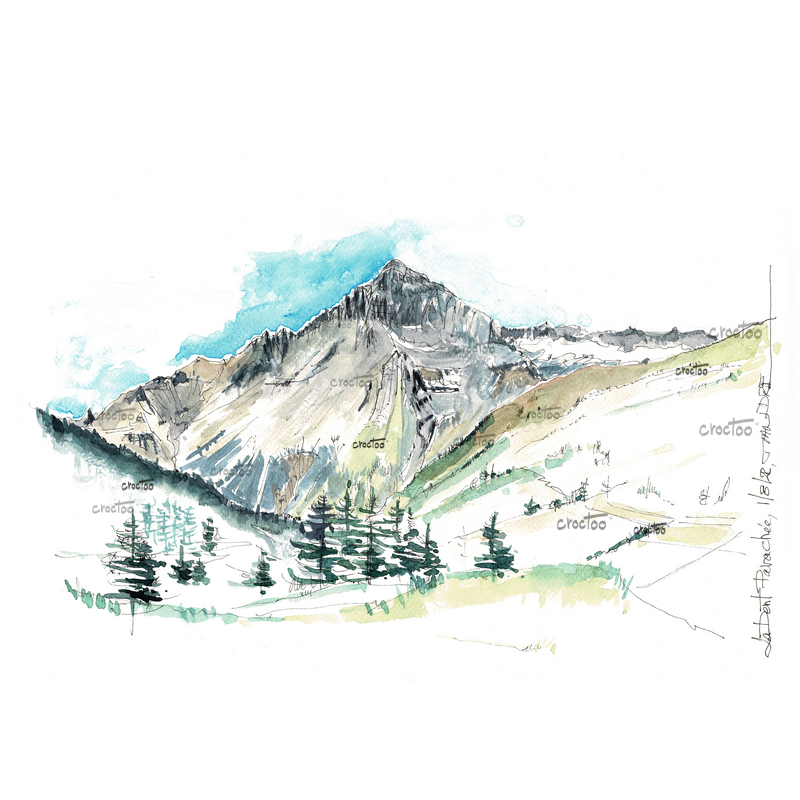 La Dent Parrachée depuis Lanslevillard : Reproduction d'un dessin encre et aquarelle de 2022